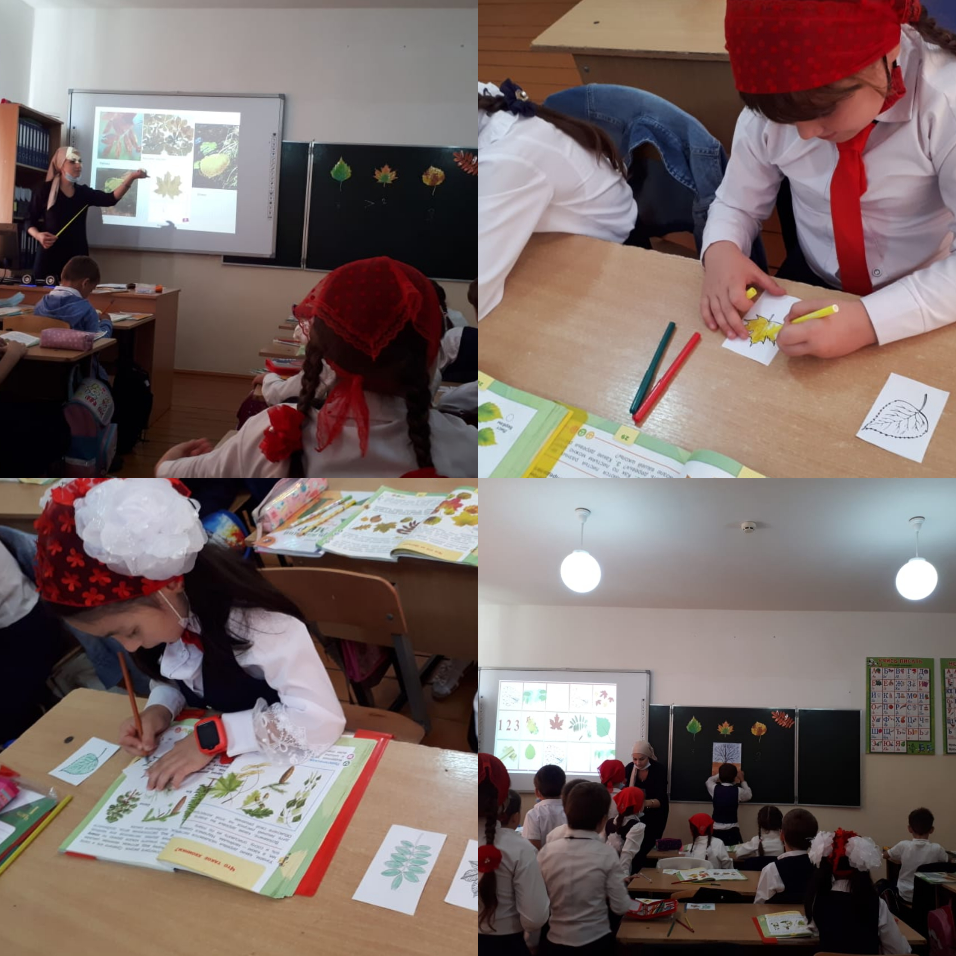Вместе со своими первоклассниками она отправилась в лес, чтобы изучить листья у дерева. Ребята выполнили исследование, чтобы определить какому дереву принадлежат различные листья, узнали, почему они опадают осенью, а также занялись и творческой работой, придумали свой осенний лист.