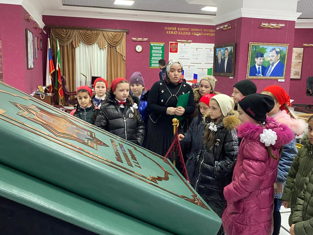 В начале экскурсии учащиеся внимательно осматривали зал и витрины , где хранятся личные вещи Ахмата-Хаджи Кадырова. Особенно понравился детям зал, где был выставлен личный кабинет Первого Президента ЧР.